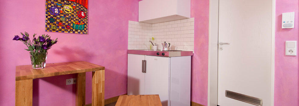 Helles Nichtraucherappartement im Erdgeschoß, Wohn-/Schlafraum (2 x 0,90m x 2,00m Betten), Dusche/WC, Ess-/Arbeitsplatz, Kitchenette mit 2 Kochplatten, Kabel-TV, highspeed DSL-Anschluss, ruhige Lage.