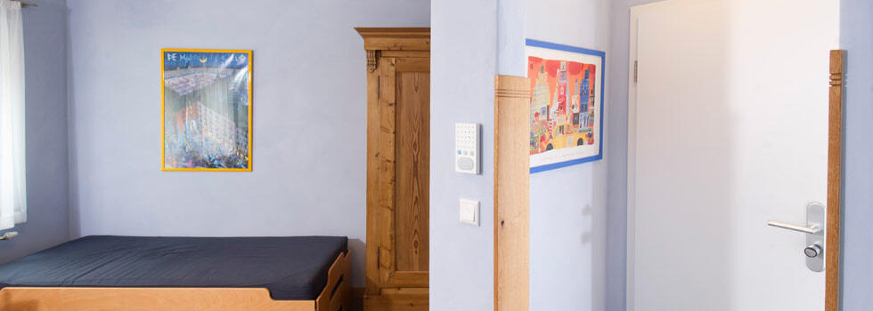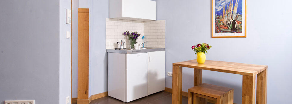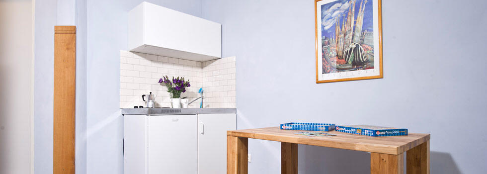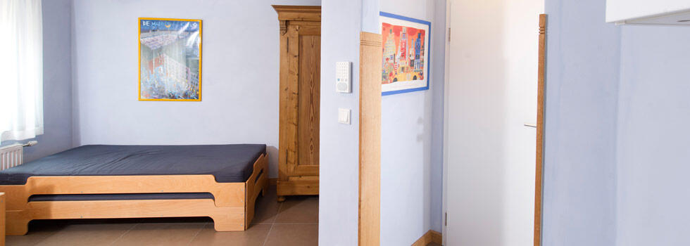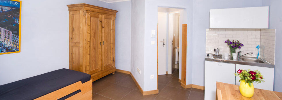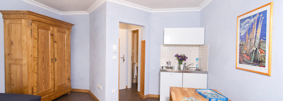 Luminoso appartamento per non fumatori al primo piano, zona giorno/notte (2 letti da 0,90 m x 2,00 m), doccia/WC, tavolo da pranzo/lavoro, cucinino con 2 fuochi, TV via cavo, connessione DSL ad alta velocità.